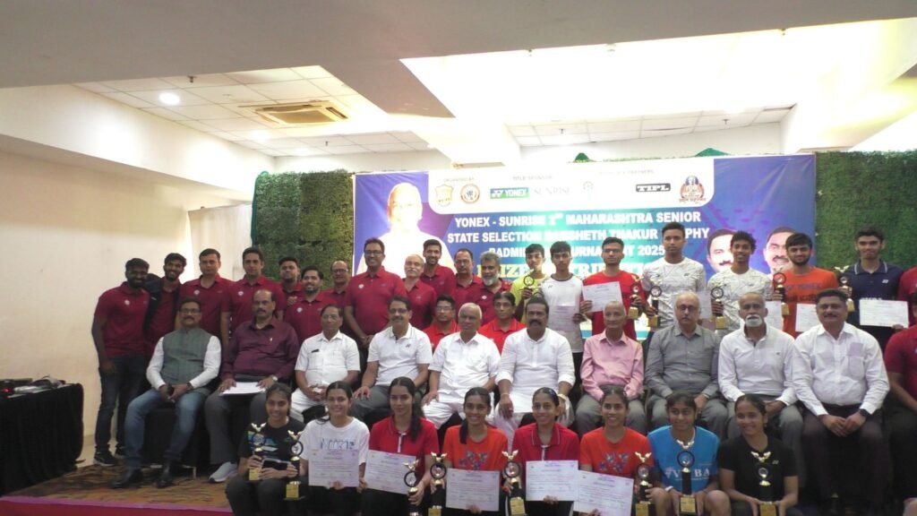 पनवेल (प्रतिनिधी) बॅडमिंटन ऑर्गनायझेशन ऑफ रायगड यांच्या वतीने व रामशेठ ठाकूर इंटरनॅशनल स्पोर्ट्स कॉम्प्लेक्सच्या सहकार्याने आणि महाराष्ट्र बॅडमिंटन असोसिएशनच्या मान्यतेने उलवे नोड येथील रामशेठ ठाकूर इंटरनॅशनल स्पोर्ट्स कॉम्प्लेक्समध्ये आयोजित करण्यात आलेली योनिक्स सनराईज द्वितीय महाराष्ट्र सीनियर स्टेट सिलेक्शन रामशेठ ठाकूर ट्रॉफी बॅडमिंटन स्पर्धा मोठ्या उत्साहात संपन्न झाली. पाच दिवस चाललेल्या या स्पर्धेत स्पर्धकांनी चमकदार कामगिरी केली. आज या स्पर्धेचा पारितोषिक वितरण सोहळा माजी खासदार लोकनेते रामशेठ ठाकूर यांच्या प्रमुख उपस्थितीत दिमाखात झाले.