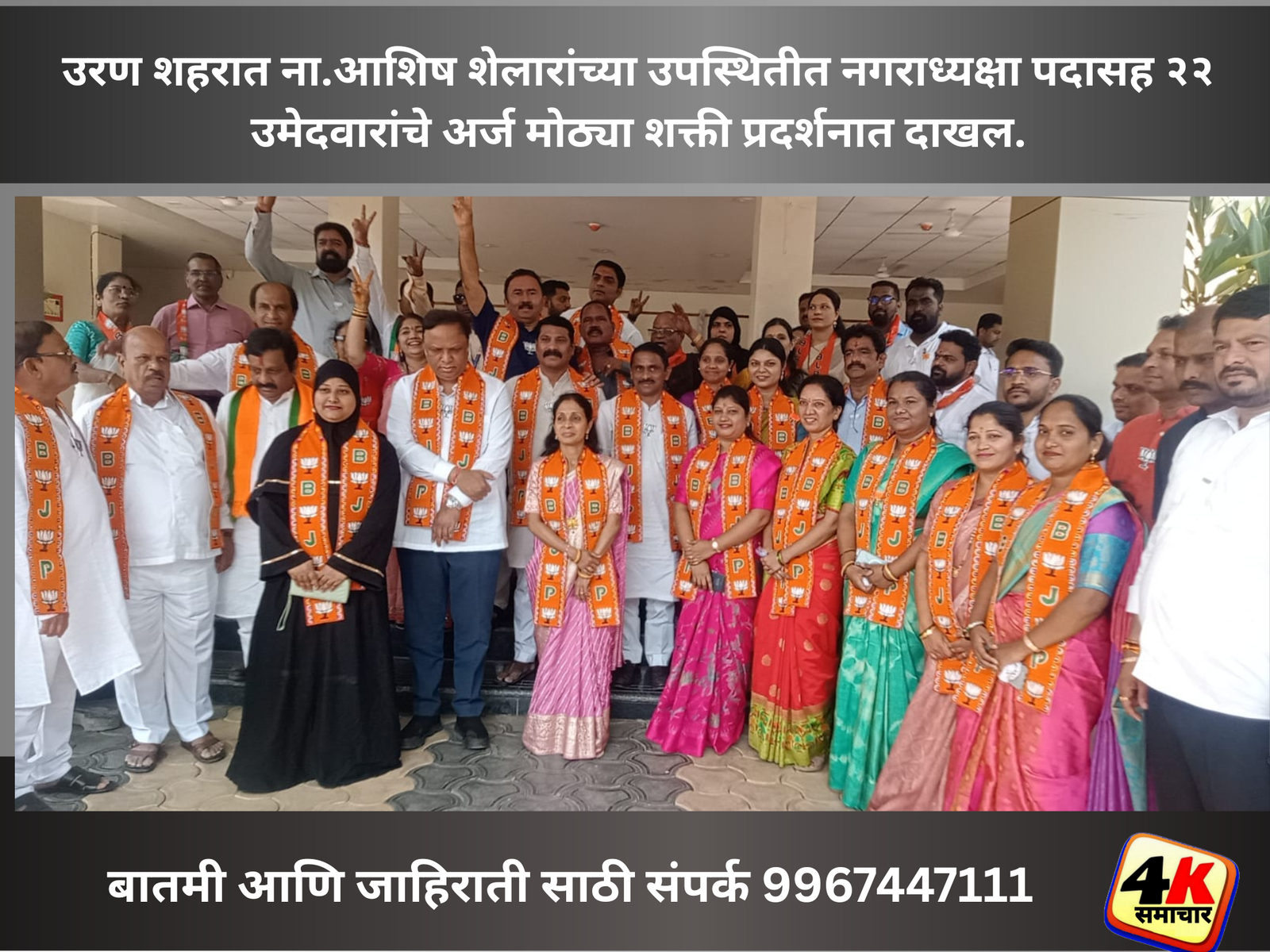 उरण नगरपरिषद सार्वत्रिक निवडणूक २०२५ च्या पार्श्वभूमीवर १३ नोव्हेंबर रोजी सकाळी ११:०० वाजता भाजपाच्या नगराध्यक्षा पदाच्या उमेदवार शोभा कोळी – शाह यांच्या समावेत भाजपाचे सर्वच्या सर्व २१ नगरसेवक पदाच्या उमेदवारांनी राज्याचे माहिती तंत्रज्ञान आणि सांस्कृतिक कार्य मंत्री तथा रायगड जिल्हा संपर्कमंत्री आशिष शेलार,पनवेलचे आ.प्रशांत ठाकूर यांच्या उपस्थितीत निवडणूक निर्णय अधिकारी तथा उरणचे तहसीलदार डॉ.उद्धव कदम यांच्याकडे उमेदवारी अर्ज दाखल केले.