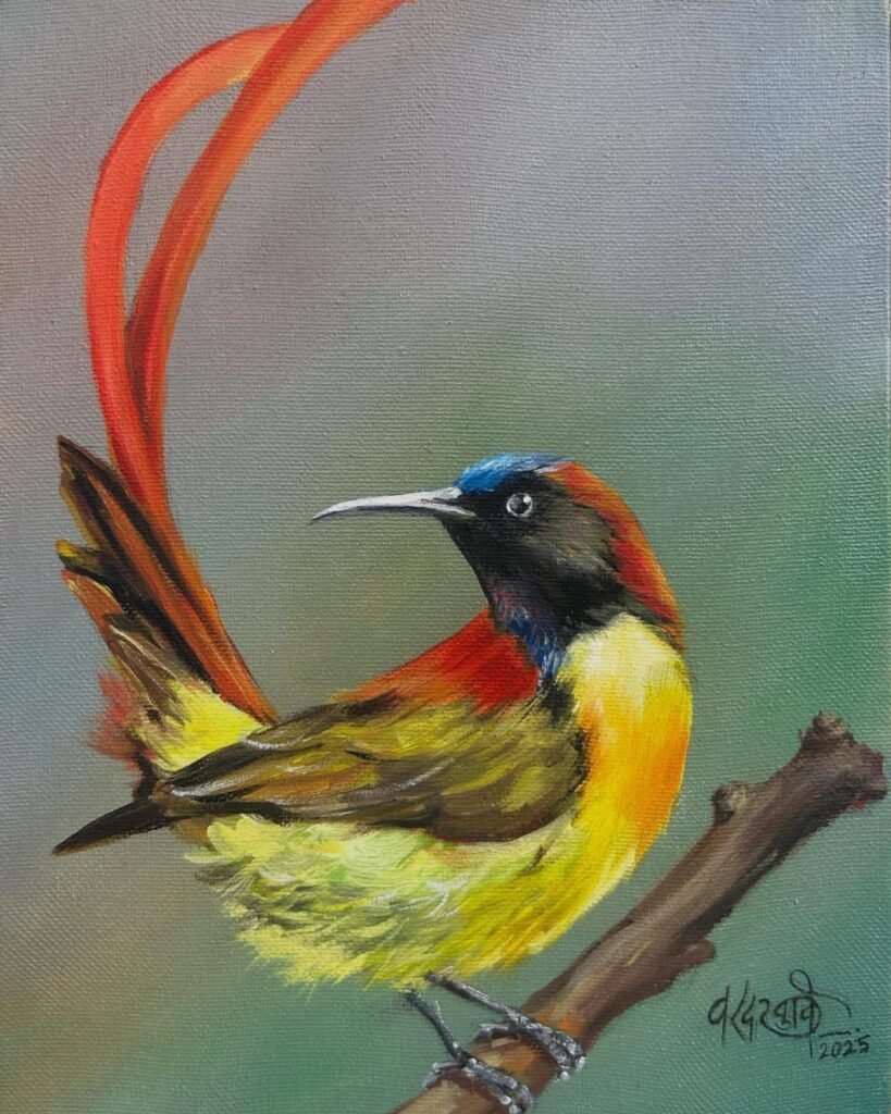 आपल्या कलेच्या माध्यमातून पक्षी संवर्धनाची गरज, पर्यावरणीय महत्त्व, निसर्गातील जैव विविधतेचे संरक्षण आणि संवर्धनाच्या दृष्टीने आपल्या रंगांच्या माध्यमातून एक पाऊल टाकल्याचे समाधान चित्रकार वरद खुशाली विलास गावंड यांनी व्यक्त केले आहे.