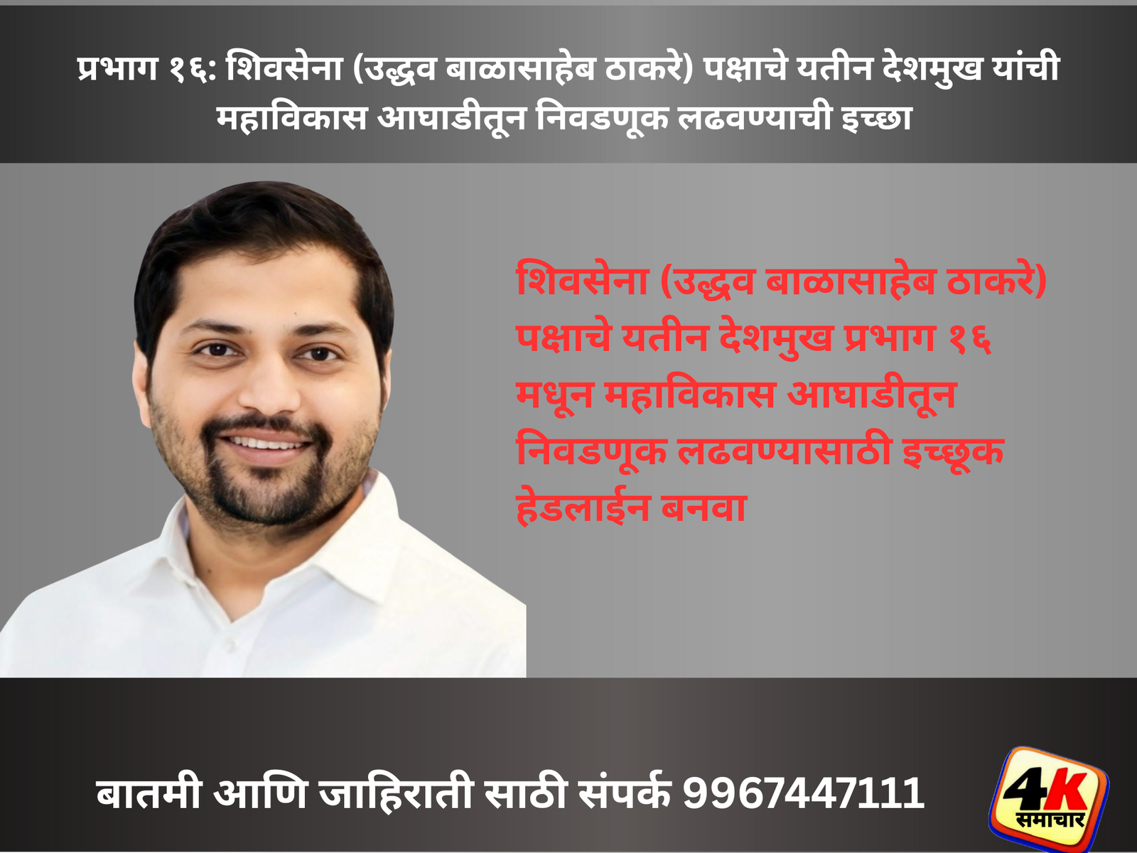 पनवेल दि.19 (वार्ताहर) : शिवसेना (उद्धव बाळासाहेब ठाकरे) पक्षाचे नवीन पनवेल शहर प्रमुख यतीन देशमुख प्रभाग १६ मधून महाविकास आघाडीतून निवडणूक लढवण्यासाठी इच्छूक असून ते निवडणुकीला उभे राहिल्यास महायुतीच्या प्रस्थापित नगरसेवकांना प्रभाग १६ मधून तगडे आवाहन उभे राहणार आहे.