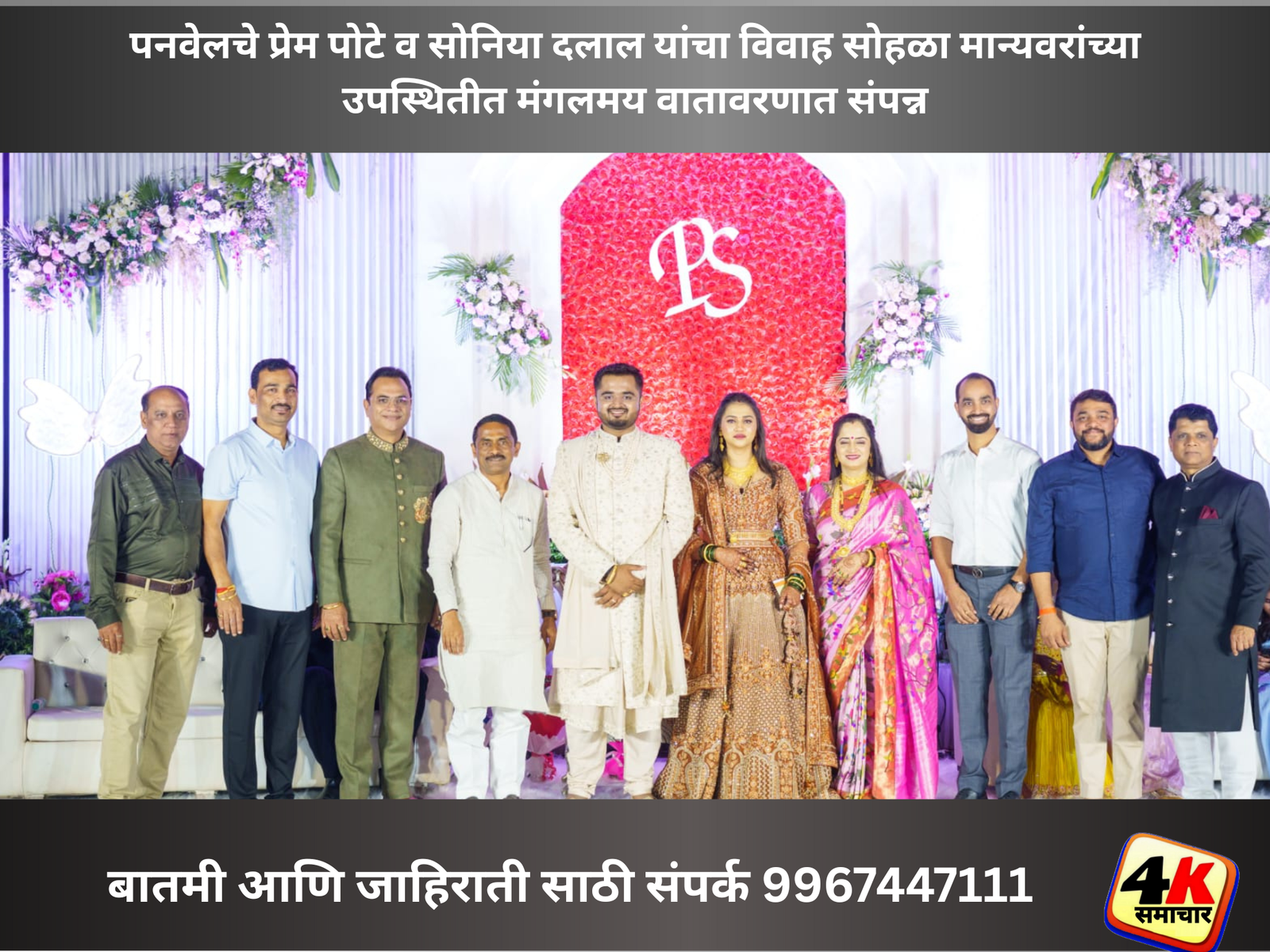पनवेल दि. 19 — पनवेलमधील सुप्रसिद्ध पोटे मसाले कुटुंबातील निलेश पोटे यांचे सुपुत्र प्रेम पोटे यांचा विवाह सोहळा नुकताच सोनिया सर्वेश दलाल हिच्याशी मोठ्या उत्साहात संपन्न झाला.