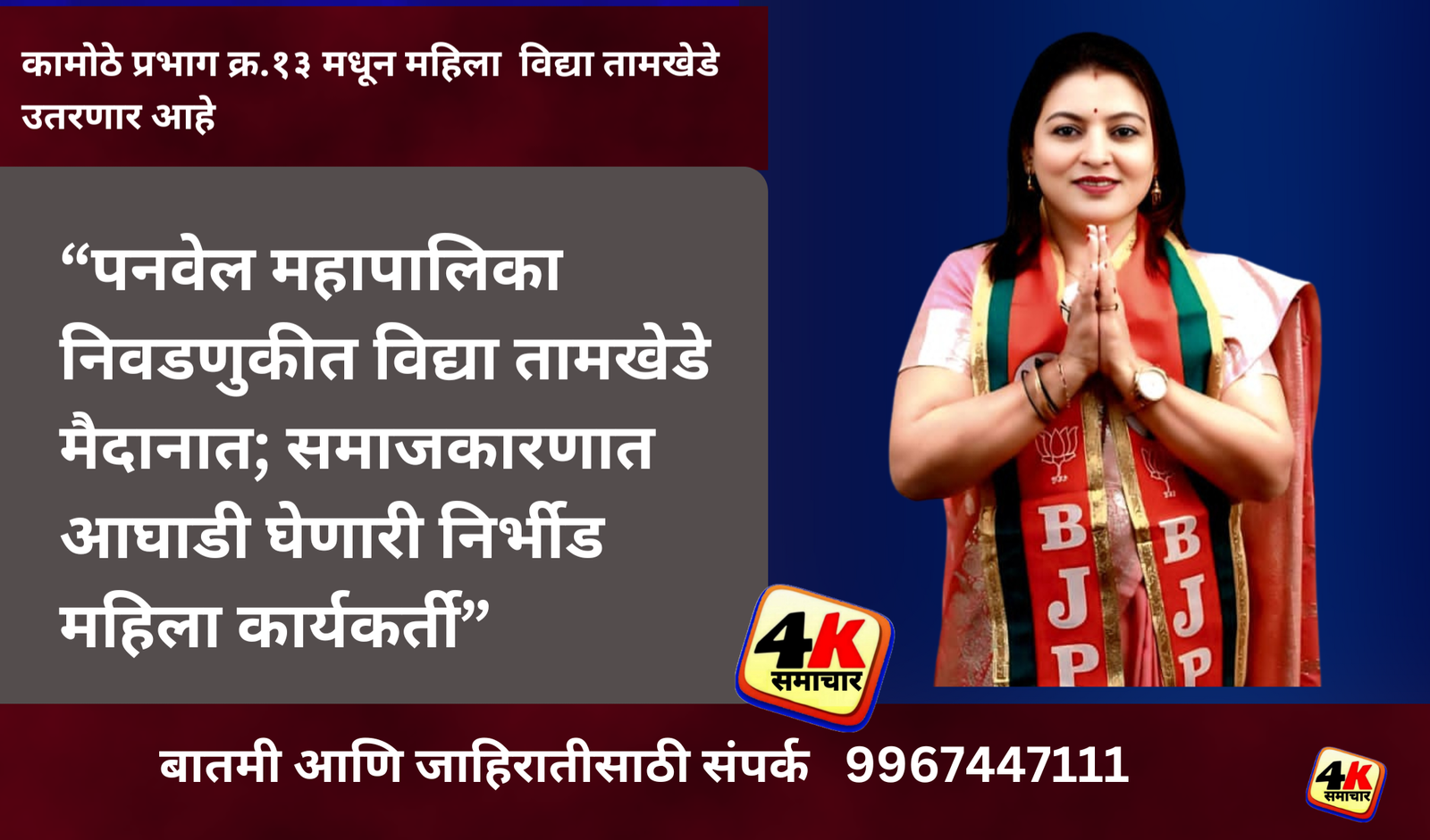 पनवेल : स्थानिक स्वराज्य संस्थेच्या निवडणुकीला सुरुवात झाली असून,लवकरच पनवेल महानगरपालिकेच्या निवडणुकांचे वारे वाहू लागणार आहेत. महानगरपालिकेत पन्नास टक्के आरक्षण महिलांसाठी असल्याने कामोठे प्रभाग क्र.१३ मधून महिला राखीव जागेसाठी विद्या तामखेडे उतरणार आहेत. ह्या प्रभागात शेकाप आणि भाजपा अशी चार जागेसाठी लढत मागील निवडणुकीत पहायला मिळाली होती. यावेळी शेकाप आणि भाजपा यांना प्रत्येकी दोन जागा मिळाल्या होत्या. राजकारणासोबत समाजकारणातही आघाडी, महिलांसाठी सातत्याने काम करणारी निर्भीड कार्यकर्ता म्हणून विद्या तामखडे यांची ओळख आहे. प्रामुख्याने धनगर समाजाच्या तर सर्व धर्म समभाव धरून सातत्याने समाजाची सेवा करण्यात त्या नेहमीच पुढे राहिल्या. पनवेल महानगर पालिकेच्या प्रभाग क्रमांक १३ मधून भारतीय जनता पार्टीकडून उमेदवार म्हणून पुढे येत असून,त्यांच्या उमेदवारीला स्थानिक नागरिक, सामाजिक कार्यकर्ते, महिला वर्गाचा उत्स्फूर्त प्रतिसाद मिळत आहे.