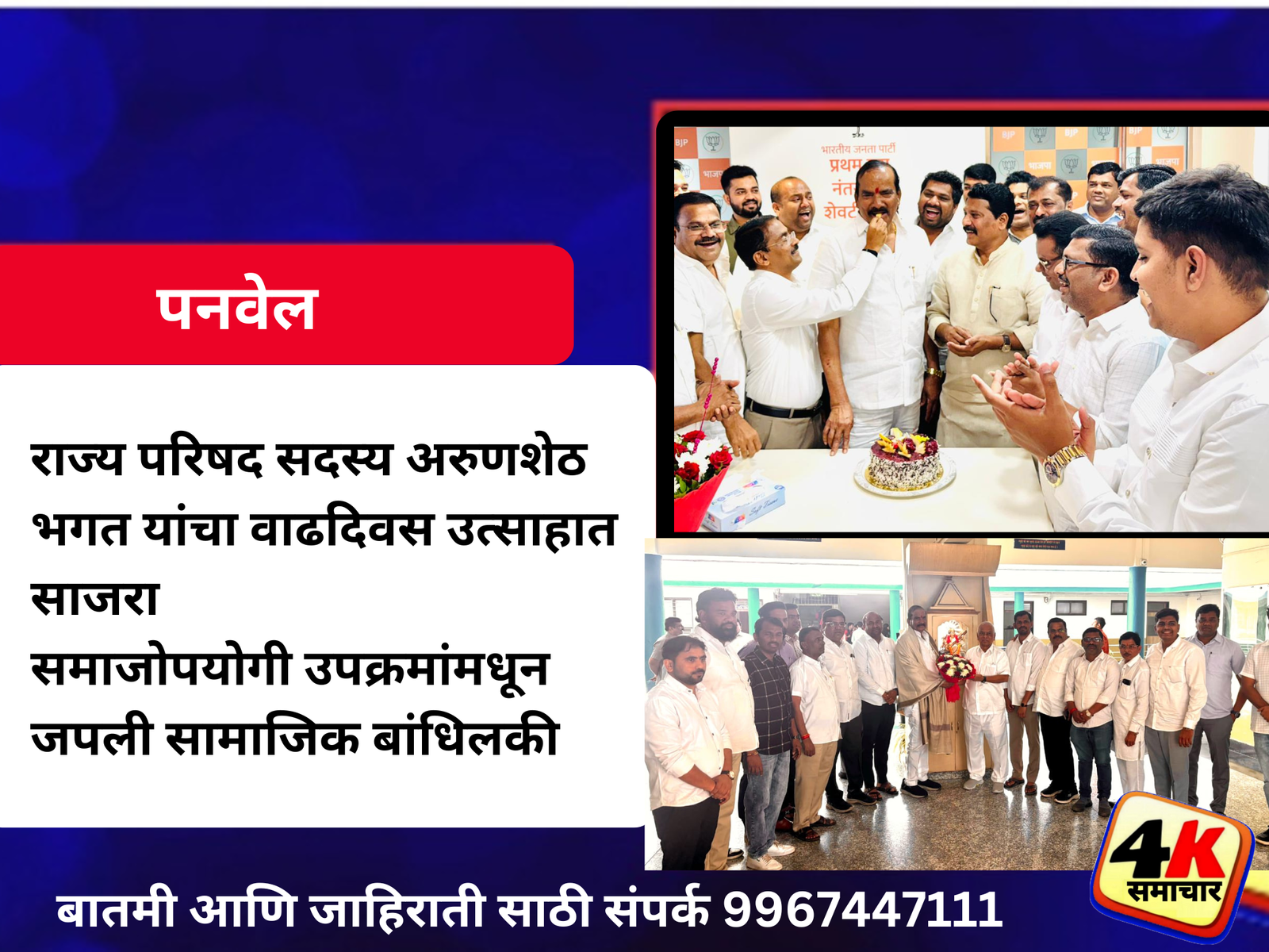 पनवेल (प्रतिनिधी) माणुसकीचे नाते जपणारे, सर्व समाजघटकांना आपलेसे करणारे आणि सतत जनसामान्यांच्या समस्यांसाठी कटिबद्ध राहणारे व्यक्तिमत्त्व म्हणून ओळख असणारे भारतीय जनता पार्टीचे राज्य परिषद सदस्य अरुणशेठ भगत यांचा वाढदिवस शनिवारी (२२ नोव्हेंबर) मोठ्या उत्साहात आणि सामाजिक बांधिलकीची जपणूक करत साजरा करण्यात आला.