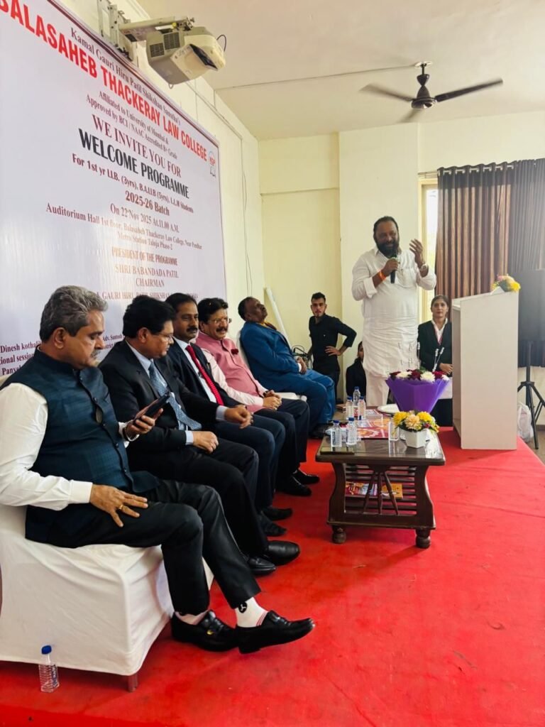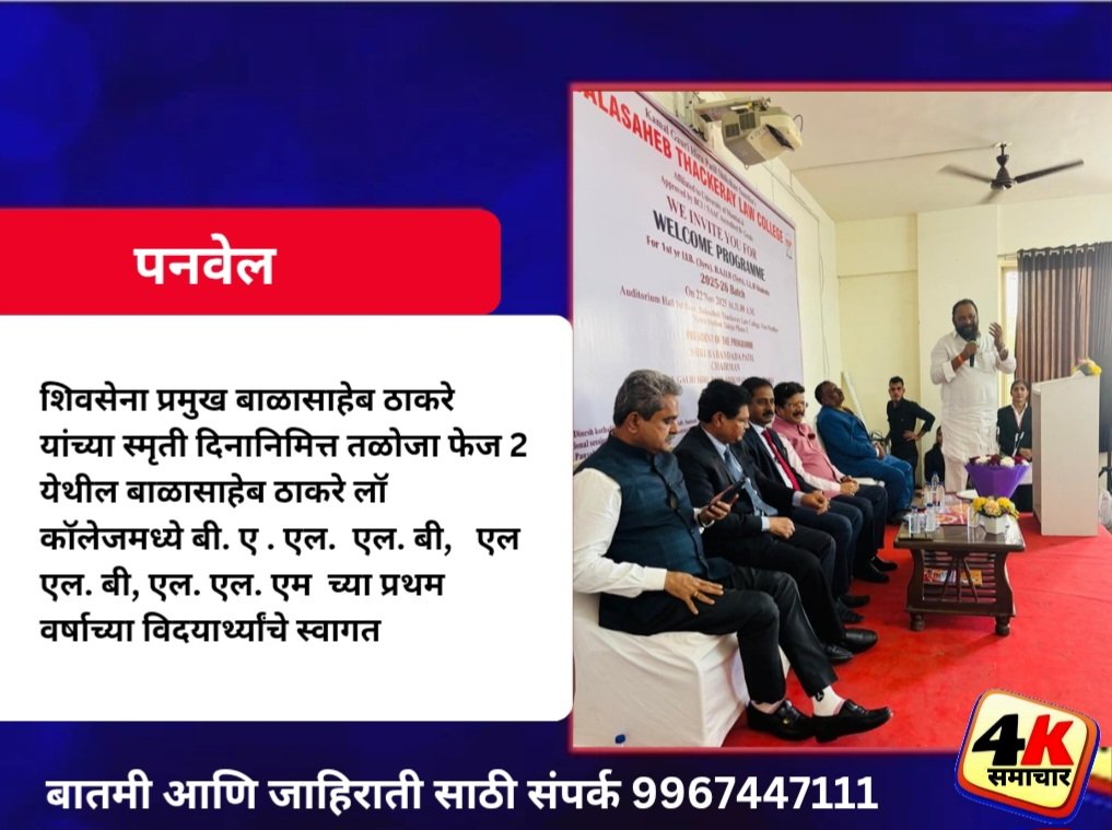 पनवेल दि. २३ ( वार्ताहर ) : शिवसेना प्रमुख बाळासाहेब ठाकरे यांच्या स्मृती दिनानिमित्त तळोजा फेज 2 येथील बाळासाहेब ठाकरे लॉ कॉलेजमध्ये बी. ए . एल. एल. बी, एल एल. बी, एल. एल. एम च्या प्रथम वर्षाच्या विदयार्थ्यांचे स्वागत (वेलकम) कार्यक्रम संपन्न झाला.