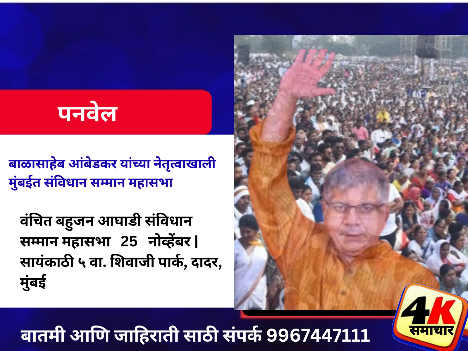 मुंबई दि. २५ : वंचित बहुजन आघाडीच्या वतीने आज सायंकाळी ५ वाजता दादर येथील शिवाजी पार्क मैदानावर “संविधान सम्मान महासभा” चे आयोजन करण्यात आले आहे. या ऐतिहासिक महासभेत पक्षाचे ज्येष्ठ नेते आणि विचारवंत बाळासाहेब आंबेडकर यांचे मार्गदर्शन लाभणार आहे.