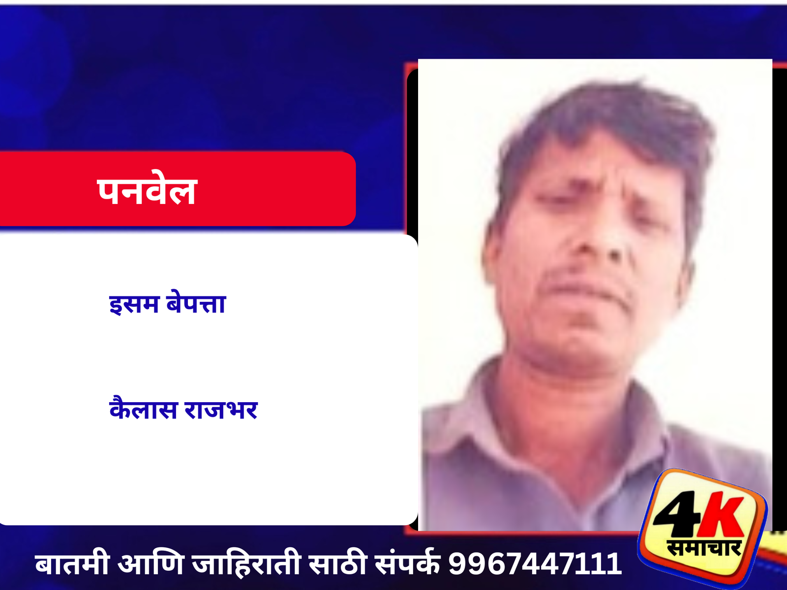 कैलास राजभर वय ४२ रा. देवीचा पाडा , हे असून त्यांचा रंग-सावळा, बाधा-सडपातळ, चेहरा-उभट, नाक-टोकदार, केस काळे