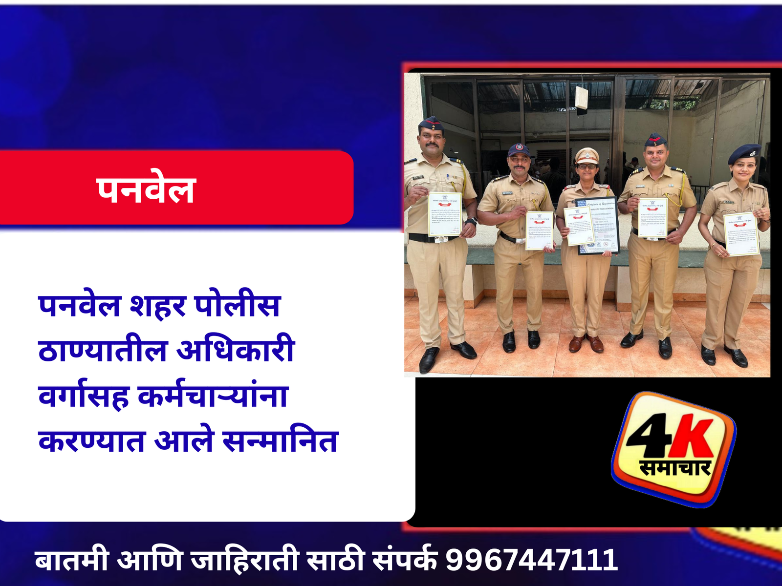नवी मुंबई पोलीस आयुक्तालयाचे पोलीस आयुक्त मिलिंद भारंबे यांच्या हस्ते पनवेल शहर पोलीस ठाण्याचे म सहाय्यक पोलीस निरीक्षक प्रज्ञा मुंढे , पोहवा माधव शेवाळे , मपोशी साधना पवार , पोना सम्राट डाकी , रवींद्र पारधी आदीनी आता पर्यंत केलेल्या कौतुकास्पद कामगिरीबद्दल त्यांना प्रोत्साहनपर प्रशस्तीपत्रक देऊन गौरविण्यात आले .